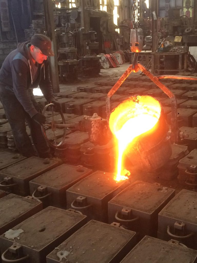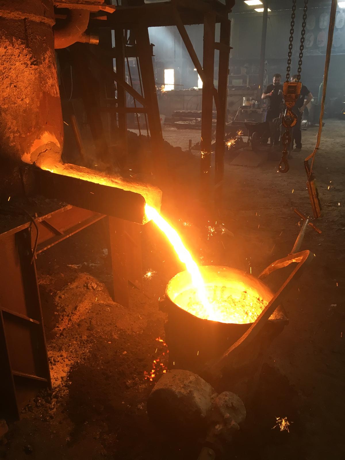 The molten metal is firstly drawn off into a pot (which can be of various sizes depending on the size of the castings to be made). A hoist lifts the the pot over the mould and the metal is poured. The process continues until all the moulds for the week have been filled.